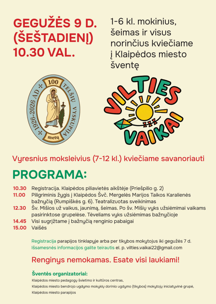10.30 val. šv. Mišios bus aukojamos už amžinatilsį vargonininką ir choro vadovą Praną Mačernį. Po šv. Mišių maloniai kviečiame paklausyti šia proga po 10-ies metų susibūrusio Prano Mačernio jaunimo choro koncertoAtkreipiame dėmesį, kad prašymą pervesti pajamų mokesčio dalį paramos gavėjams galima pateikti iki 2026 m. gegužės 4 d.